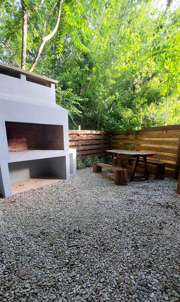 - Patio con mesa y bancos de quebracho